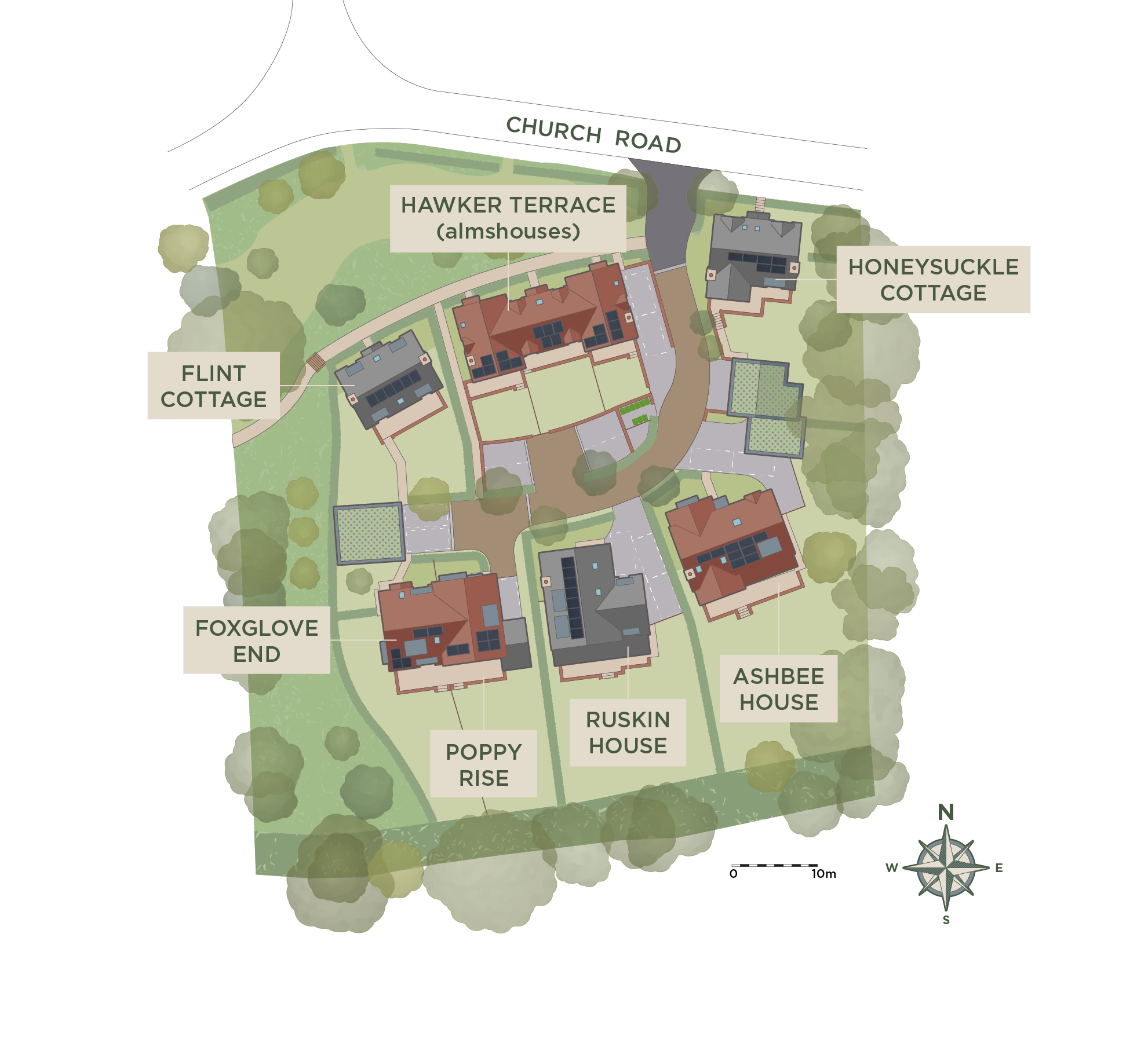 The site includes a terrace of three 2 bedroom houses that will be purchased by the Eames Almshouses Trust as a welcome addition to their portfolio of affordable homes for local people. The attractive new homes share a unified wide frontage with gabled detailing, crafted brickwork and porched front doors creating a delightful country cottage aesthetic.